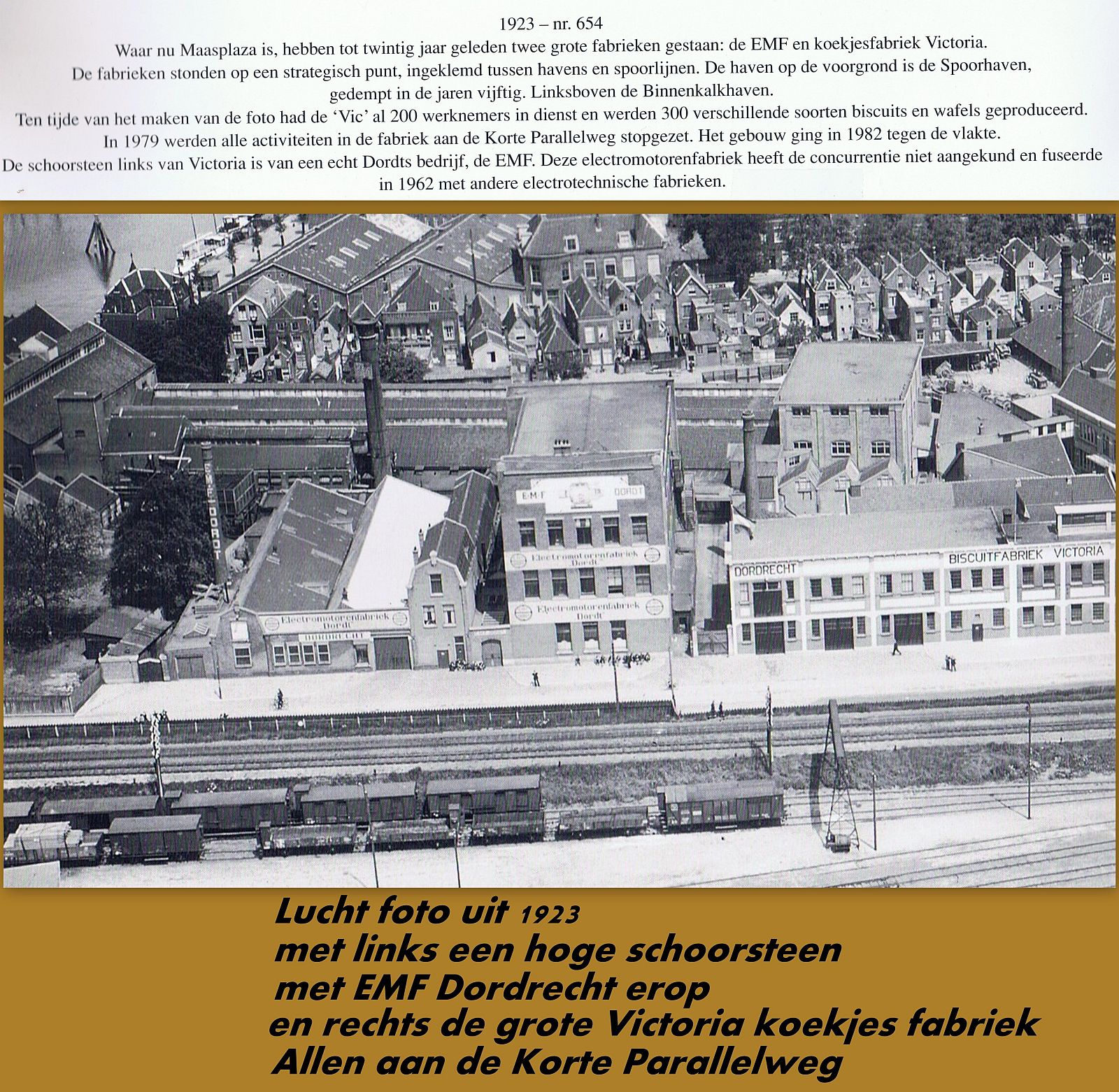 Eerder stuurde Jas Krug mij onderstaande luchtfoto uit 1923 waarop de fabriek van EMF Dordt en rechts daarnaast de koekjesfabriek Victoria te zien zijn. Als jongen van een jaar of 12 ging hij regelmatig mee met de bode Roth die de motoren vervoerde naar Amsterdam. Jas woonde ook vlak bij de fabriek van EMF Dordt en kwam er vrijwel elke dag.