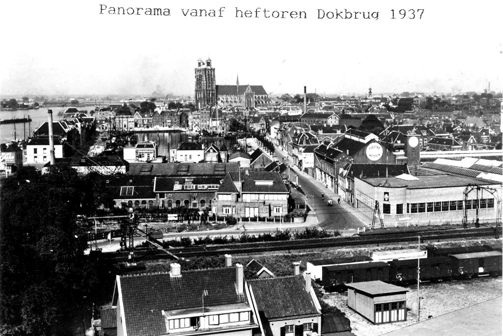 Panoramafoto van Dordrecht vanaf de Hefbrug genomen. De datering is 1937. Rechts in het midden zien we EMF Dordt.