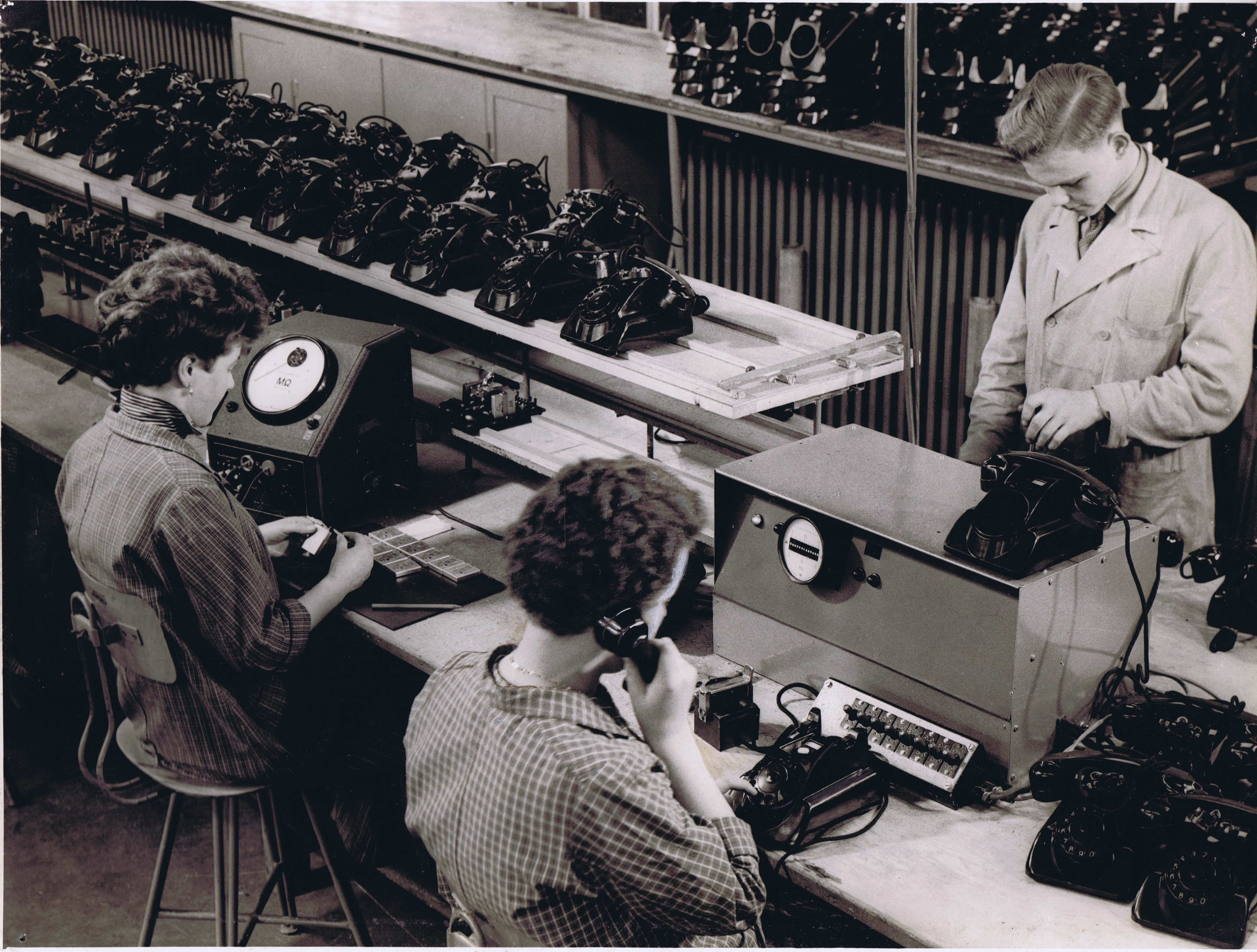 Foto 7: telefonie fabricage Heemaf, wellicht in Coevorden? Een identieke telefoon uit 1952 heb ik nog werkend in huis naast een moderne huistelefoon van Philips.